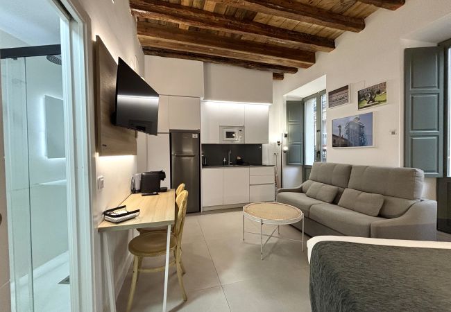 Este amplio apartamento tipo estudio (segunda planta con ascensor) se encuentra en un edificio histórico de mas de 300 años, recién reconstruido. Está ubicado a tan solo 250 m del Mercado de San Miguel, a 300 m de la Plaza mayor y a 750 m del Palacio Real y la Puerta del Sol.